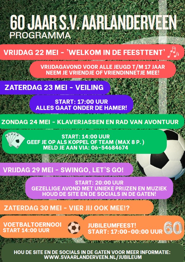 Houd de website de komende tijd scherp in de gaten voor alle details per activiteit. Dit wil je niet missen! Link naar de site: https://www.svaarlanderveen.nl/jubileum